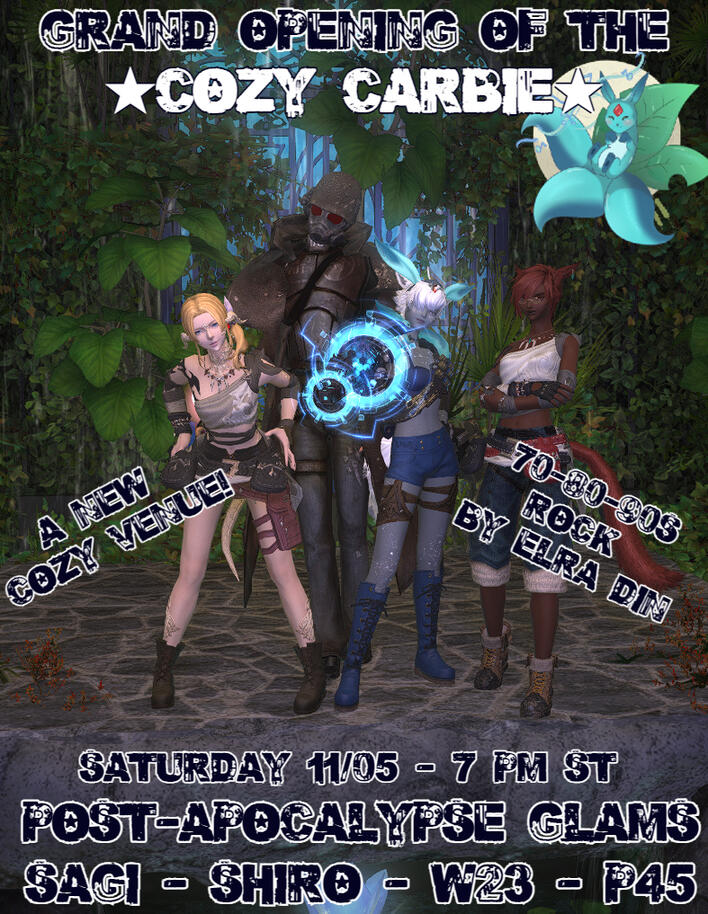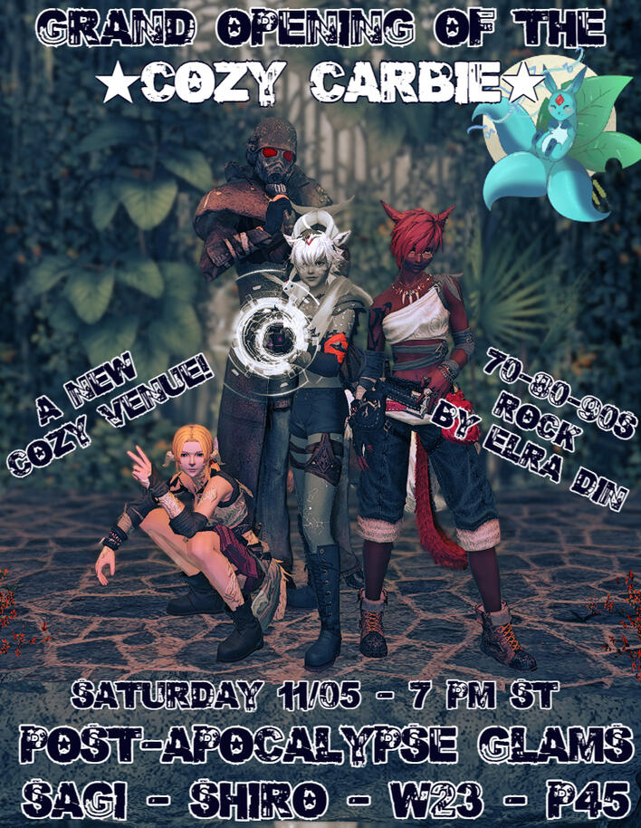 We have stopped updating events on Partake, please check our Discord or Website <3 - We welcome you with a social /say chat alternating our 3 cozy SFW venues the Cozy Carbie, the Cozy Forest and Cozy Carbuncle every Saturday at 21 CET with music by Elra Din ranging from popular Rock to Dance hits. - With a smol preparty in the garden starting around 30 mins beforehand for the early birds and an Ending Ritual each party! Every week we do a different glam theme, you can join us vanilla, mare or both! Not mandatory but encouraged! Events like Glam Contests & Deathroll Tournaments. Giveaways: Minions & more, RP bar, Gpose Services, VFX Dancer!