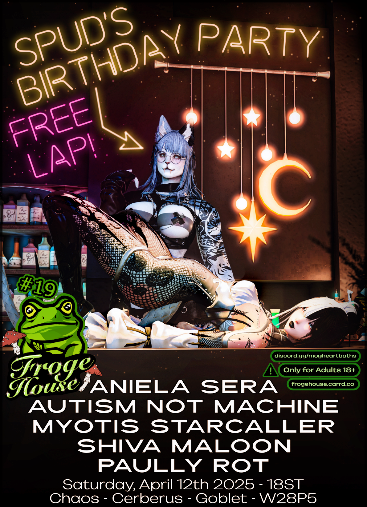 Froge House is a heavily NSFW Nightclub located on Cerberus, Goblet 28P5. Clothing is entirely optional and our minigames encourage losing them. NSFW activity is encouraged throughout the whole venue. (Seriously whoever said we're SFW can shove it.) Created in part by requests of the Mogheart patrons who couldn't make it on Thursday but were free on Saturday. No giveaways, no VIP, no AKFs (pls afk upstairs at the entrance or outside if we're at 80+ people)