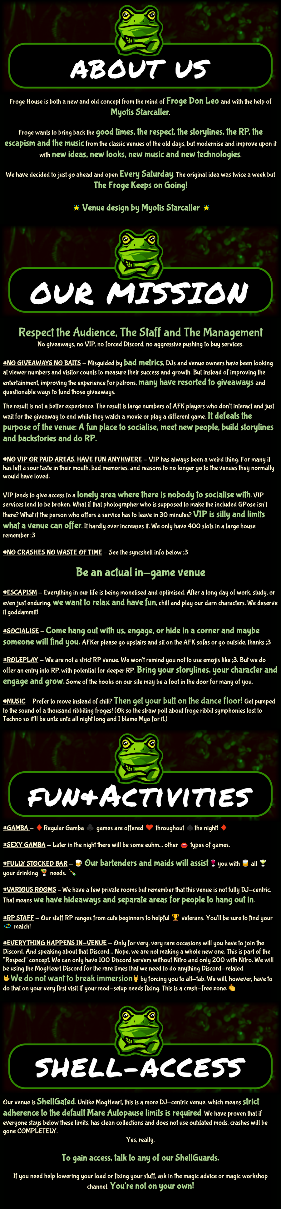 Froge House is a heavily NSFW Nightclub located on Cerberus, Goblet 28P5. Clothing is entirely optional and our minigames encourage losing them. NSFW activity is encouraged throughout the whole venue. (Seriously whoever said we're SFW can shove it.) Created in part by requests of the Mogheart patrons who couldn't make it on Thursday but were free on Saturday. No giveaways, no VIP, no AKFs (pls afk upstairs at the entrance or outside if we're at 80+ people)