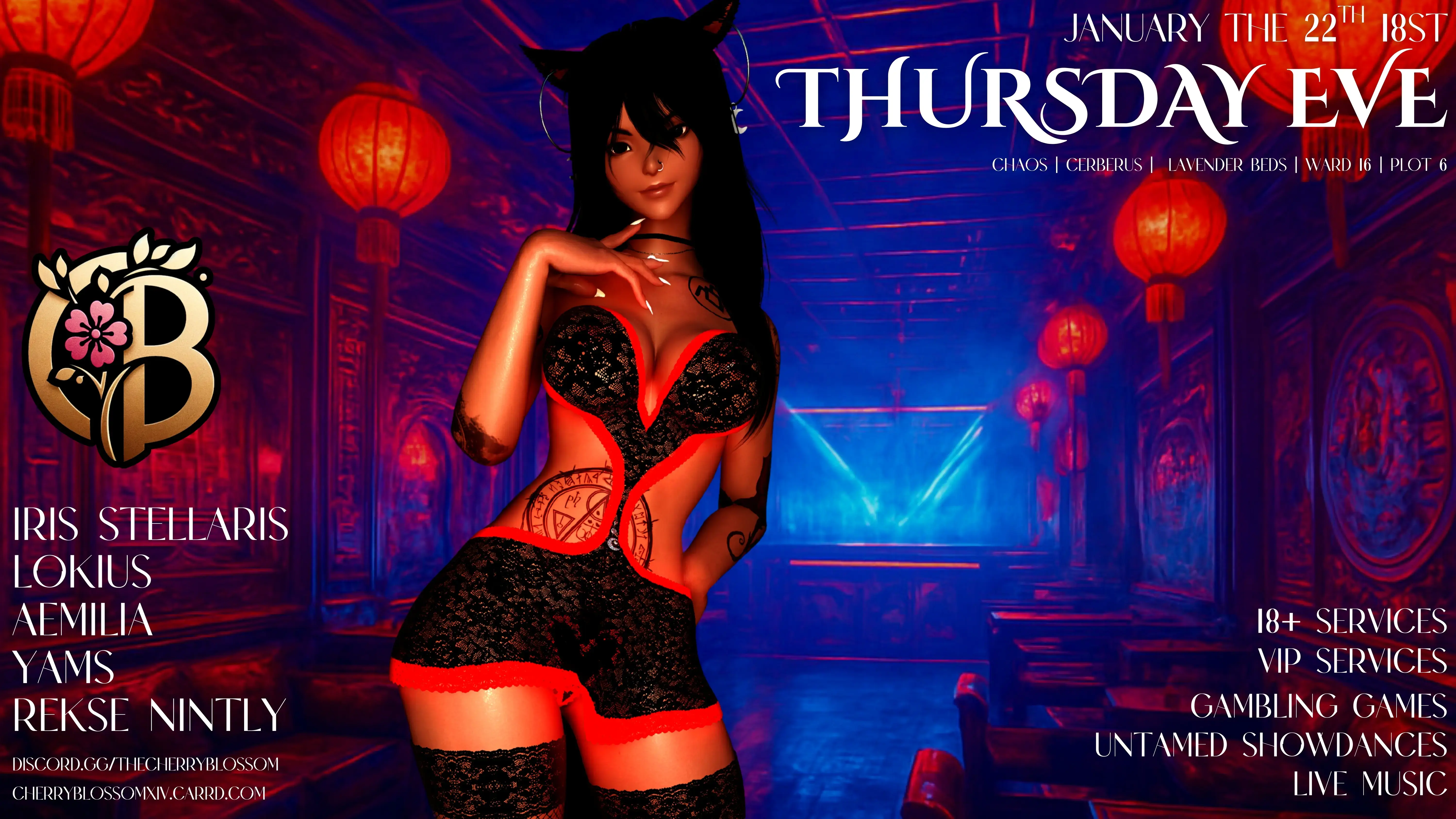 The Cherry Blossom is Chaos's finest adult nightclub and hotspot for 18+ entertainment. We offer a wide selection of NSFW talent as well as drinks, exciting dj's lineups and some of the most unique gambling on Chaos! Come on by and say hello, we promise you'll love it! We open at 19:00 ST on Thursdays, and 19:00 ST on Saturdays. During summer we anticipate both opening and closing by one hour. The Venue is located at (Cerberus) Lavender Beds- Ward 16 - Plot 6.